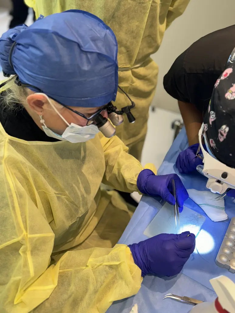 Instead of cutting the hair shaft during follicle harvest, the surgeon uses a specialized hybrid punch designed to excise the follicle while preserving the full hair length. This allows the transplanted grafts to be placed with their hair shaft intact.
