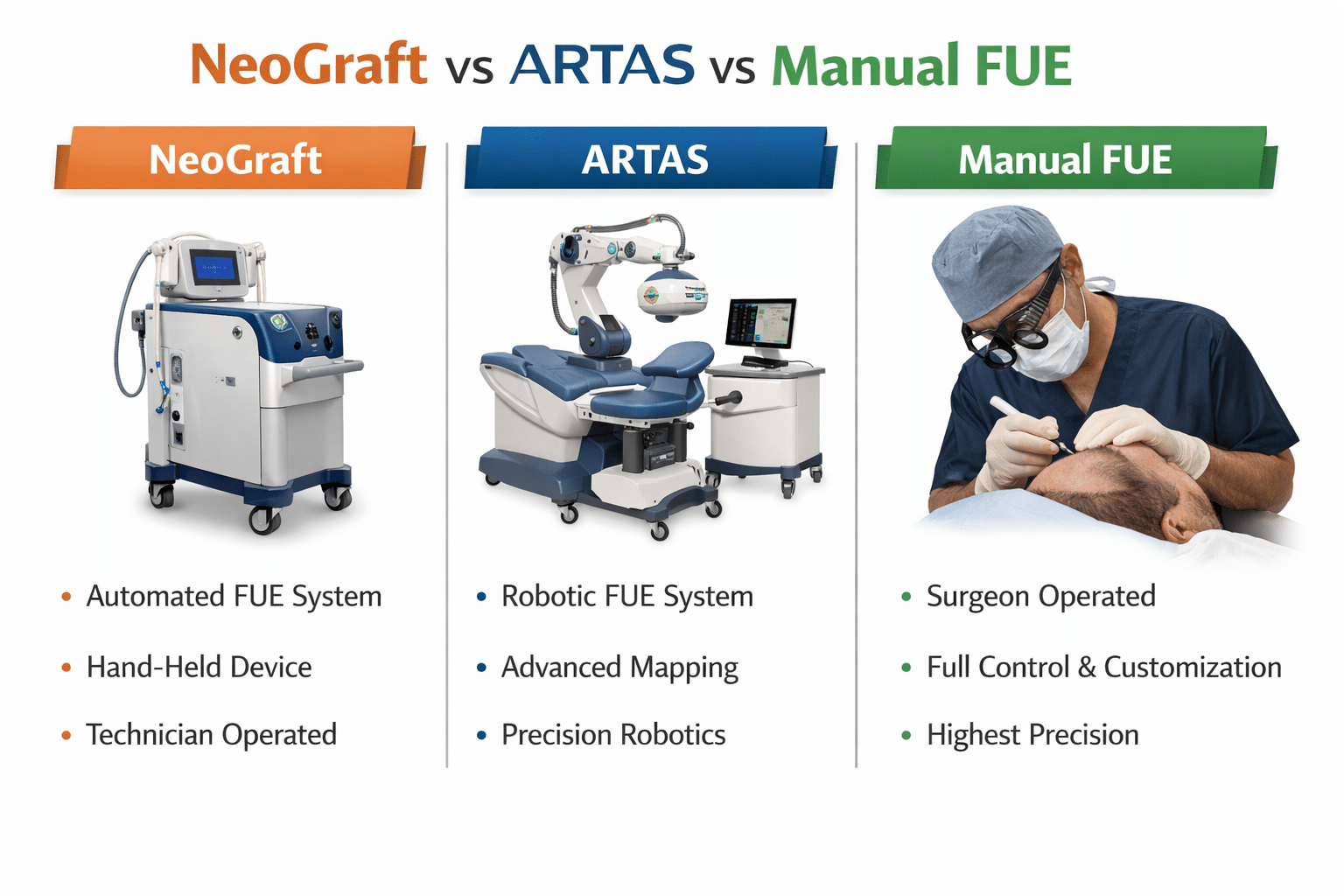 The robot prioritizes efficiency and consistency, but hair transplantation requires artistry and judgment, which only an experienced surgeon can provide. The Most Important Factor: Surgeon Involvement The biggest difference between NeoGraft, ARTAS, and manual FUE is who is actually performing the surgery. Hair transplant quality depends on: