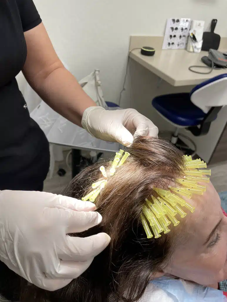 PDO thread hair loss treatment involves the insertion of tiny needles into the scalp, through which small threads called polydioxanone (PDO) are inserted into the scalp. These threads stimulate collagen production, leading to increased blood flow to the scalp and hair, which stimulates hair growth. The treatment is minimally invasive and has been found to be effective in treating hair loss in both men and women.